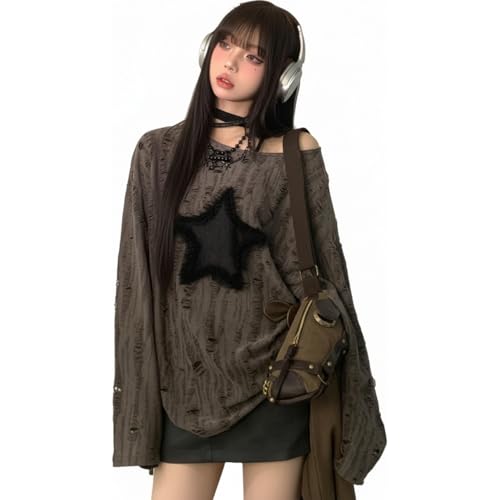 長袖 Tシャツ レディース ダメージ加工 星柄 ロンT オーバーサイズ パンク ロック カットソー クルーネック ゆったり 穴あき トップス カジュアル ストリート Y2K サブカル系 おしゃれ