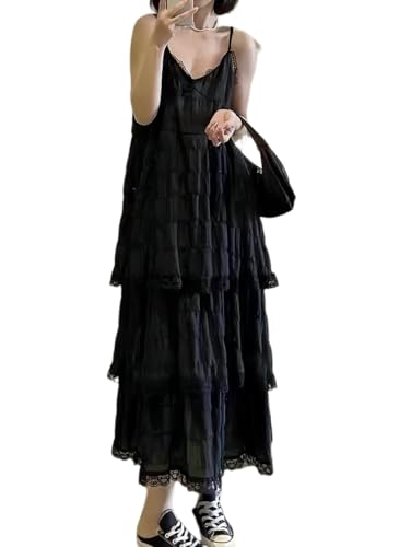 [KKAERDIYA] フリルティアードキャミワンピース ティアードレース キャミソールワンピース, ロング丈, ホワイト, ブラック, 2カラー展開 (JP, アルファベット, M, ブラック)