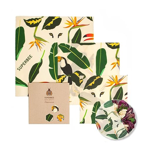 SuperBee 蜜蝋ラップ 3枚セット|野菜・チーズ・ボウル・サンドイッチ用 再利用可能な食品用ラップ|ジャングル柄のサステナブルなワックスペーパー