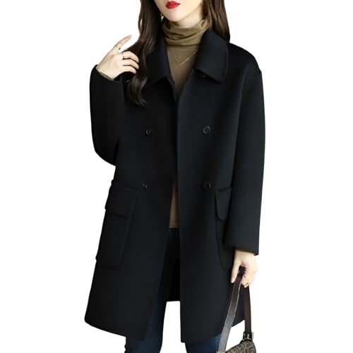 [Caividom] 小柄向けウールコート 厚手韓国風ロングコート 秋冬用保温性アップ ポロ襟×ダブルボタンデザイン リフィット オフィスカジュアル対応 黒 x_l