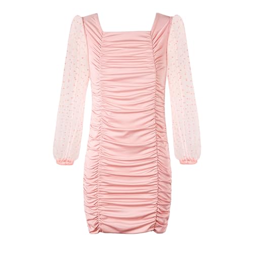 Rolanko ガールズ シャーリングボディコンドレス、スクエアネック長袖スイスドットメッシュミニドレス トゥイーンティーン向け, ピンク, 14-15 Years