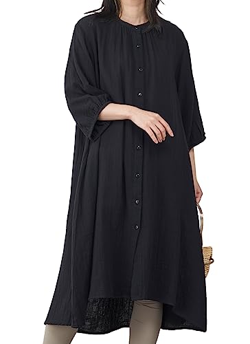 [SPAN] 423 オーガニックコットン シャツワンピース インド綿 綿100 ダブルガーゼ ワンピース ロングワンピース 七分袖 ロングシャツ (L, ブラック)
