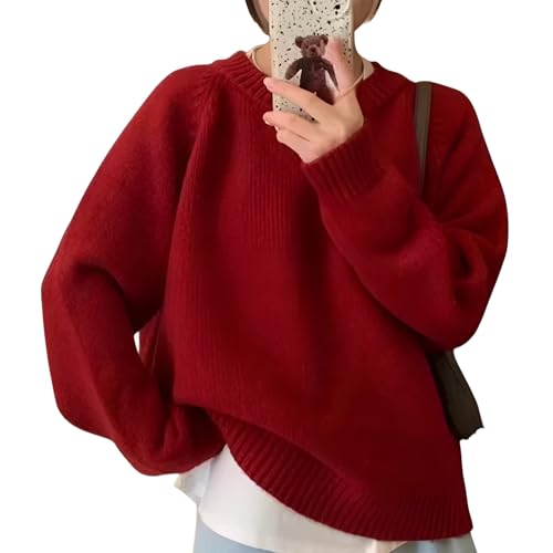 [Arklove] クルーネットセーター冬用 オーバーサイズ シルエット調整 厚手柔らかニット 大人女性の日常着 スリム効果/保温性両立 カジュアル/オフィス着回し 赤