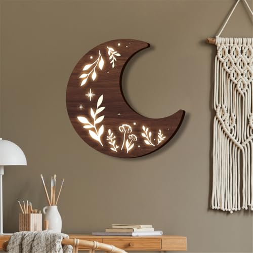 木製ムーンフェイズウォールデコレーション、壁掛けムーンナイトライト、LED木製彫刻ナイトライトウォール彫刻、3D木製ムーンスターLEDナイトライトウォールステッカーリビングルームベッドルームホームデコレーション(B)