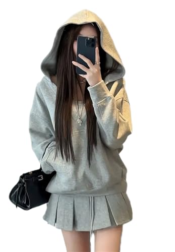 [OIUYUE] セットアップ フードパーカー ミニスカート タンクトップ レディース スウェット トレーナー プリーツスカート ゆったり ジャージ 3点セット 韓国 ショート(Mグレー)