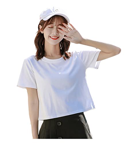 [優億] レディース ショートシャツ 綿 半袖 tシャツ ショート丈 丸首 おしゃれ トップス ゆったり へそ出し 夏服 カットソー 着瘦せ ダンスウェア きれいめ カジュアル シンプル 通勤通学 無地 (M, B01 ホワイト)