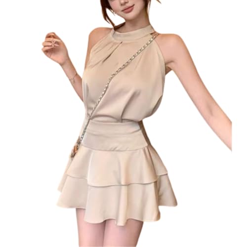 [AQUA Marine] レディース ワンピース ミニ丈 ハイネック ノースリーブ フレア ティアード Aライン ウエストマーク 脚長見え 体型カバー きれいめ 韓国風 デート お出かけ 春夏 秋冬 (JP, アルファベット, S, ベージュ)