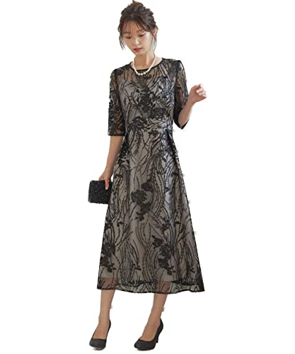 [niana] 結婚式 ワンピース パーティードレス 総レース シアー 5分袖 刺繍 レースブラック M