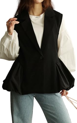 [sawa á la mode] 甘辛 な 大人 スタイル 異素材 ジレ ジャケット レディース ファッション アウター ジャケット ベスト ジレ 異素材 バルーン 菱襟 ノースリーブ 無地 swmam-190233 Free Size ブラック